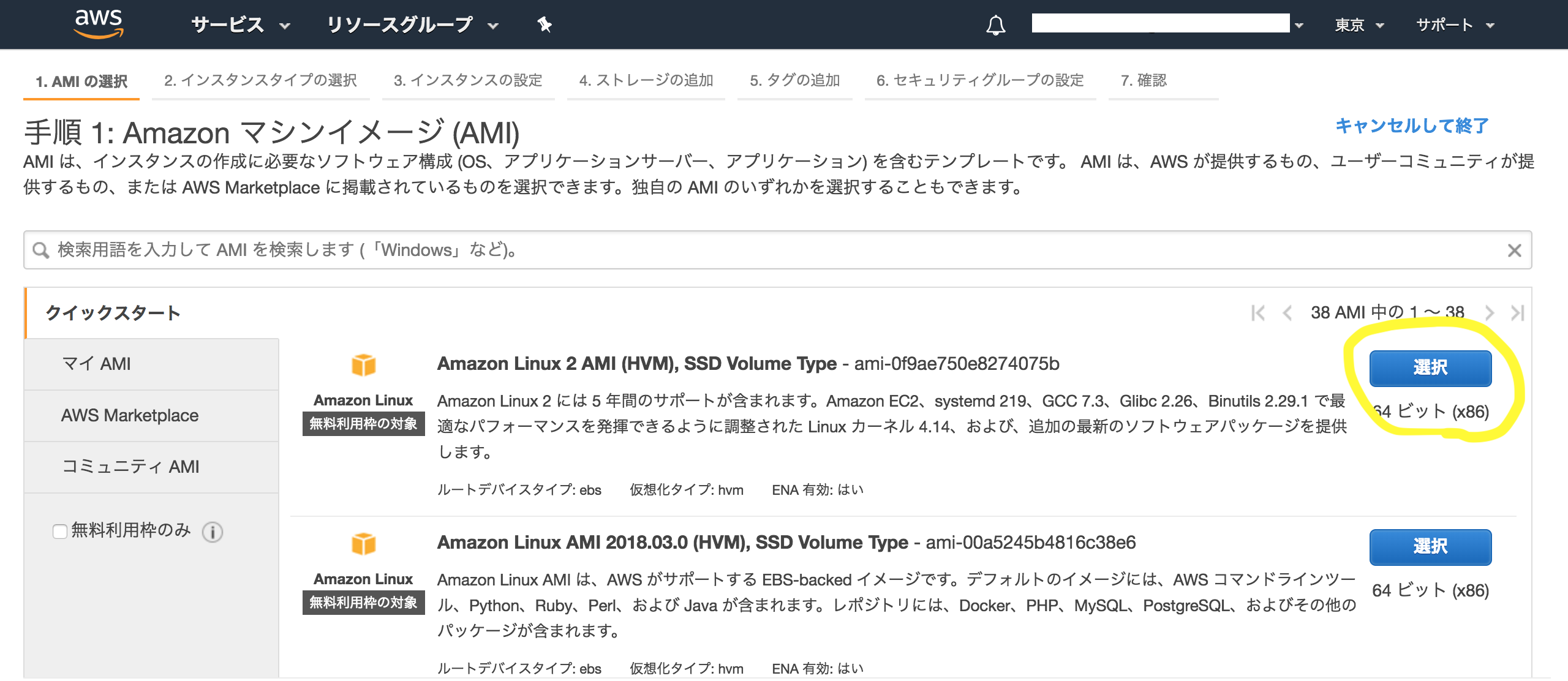 手順1: AMI(仮想マシンの種類)を選択する。今回は、無料枠の範囲内で、一番上のAmazon Linuxを利用する。