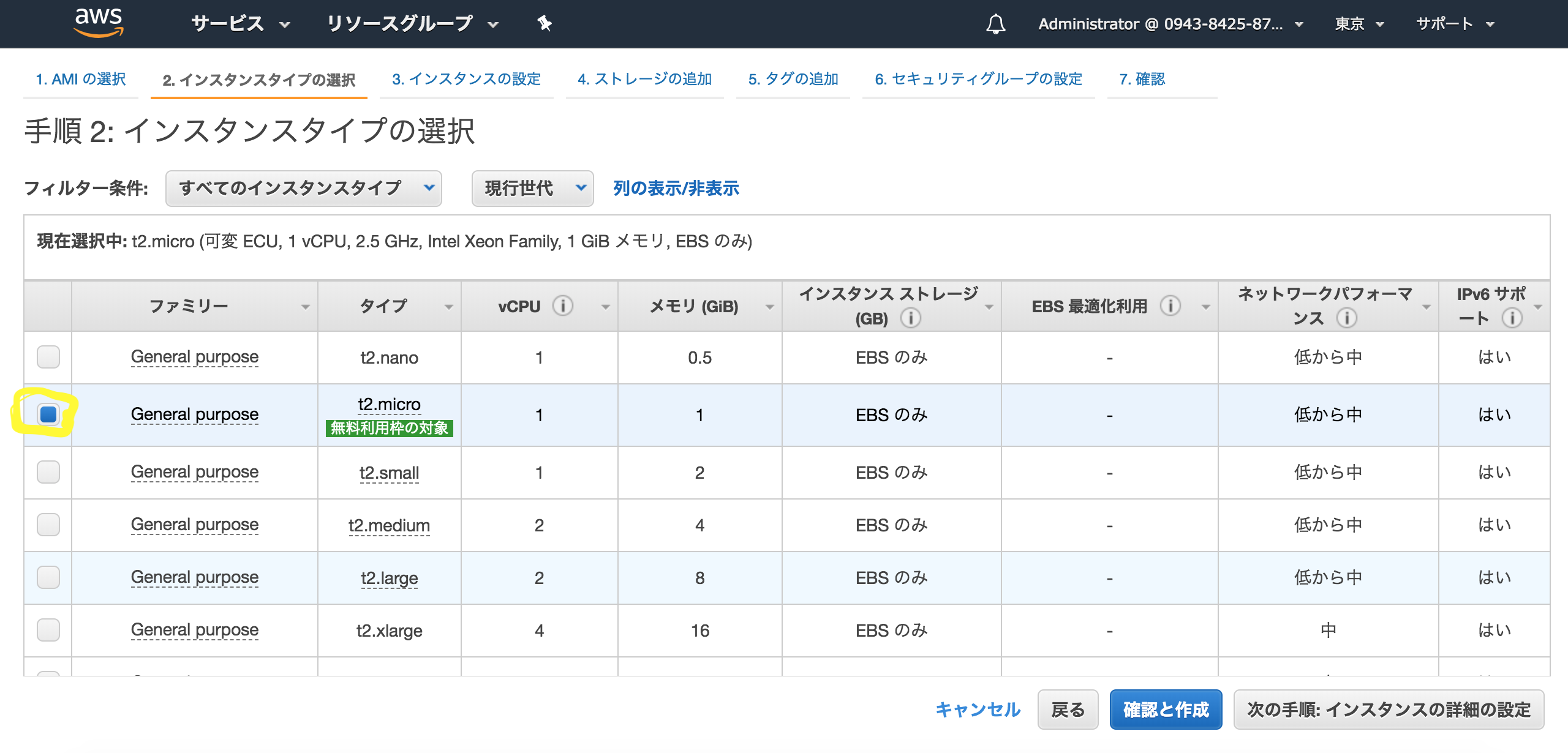 手順2: EC2インスタンスのタイプ選択。メモリやCPUなどを決めていきます。