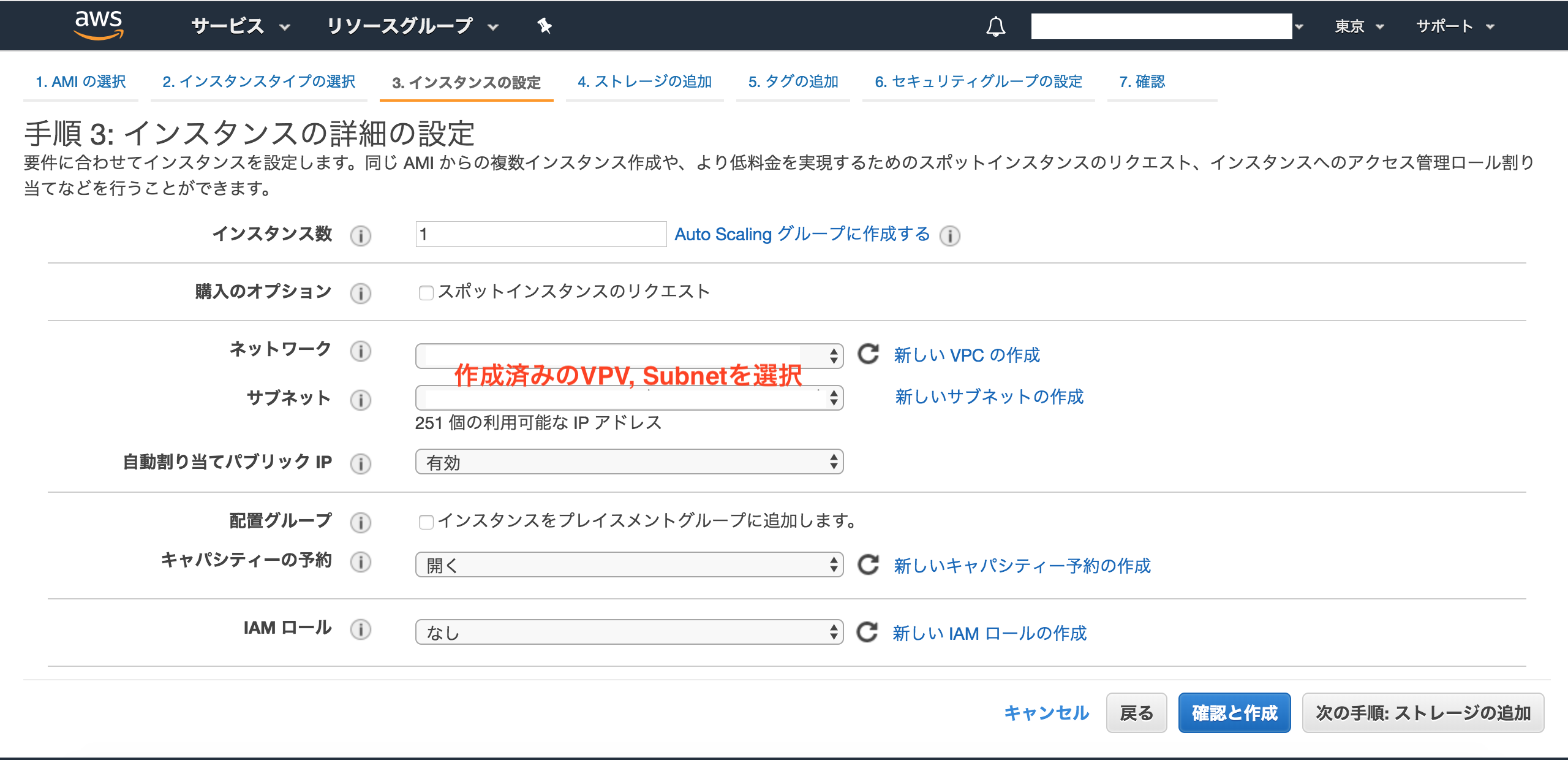 手順3: インスタンス設定 (自動割り当てパブリックIPは最後に固定します)