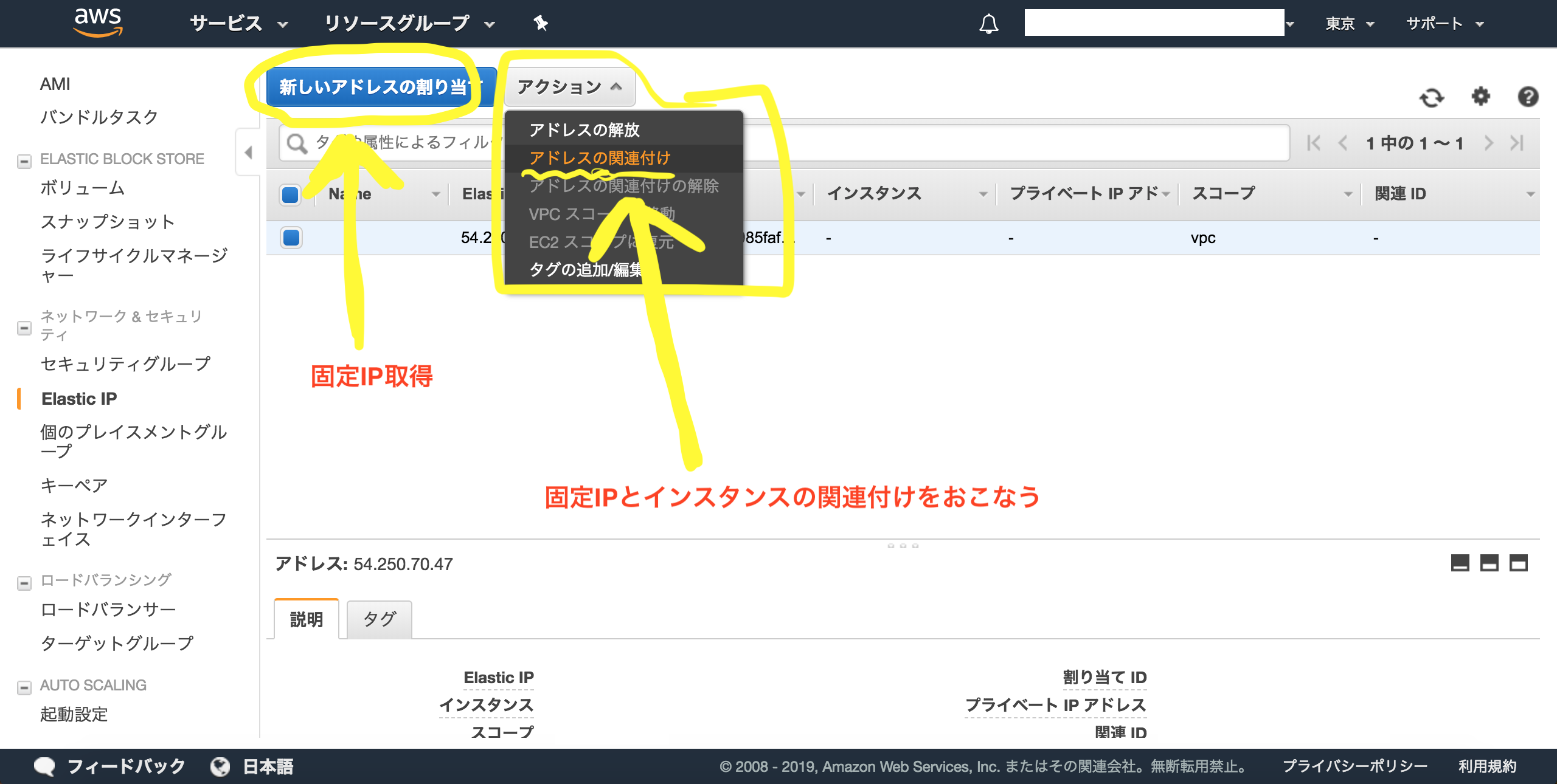 最後に: Elastic IPの作成、紐付け (サーバーのグローバルIPは再起動させるたびに変わってしまう *手順3のパブリックIP自動割り当ての通り)