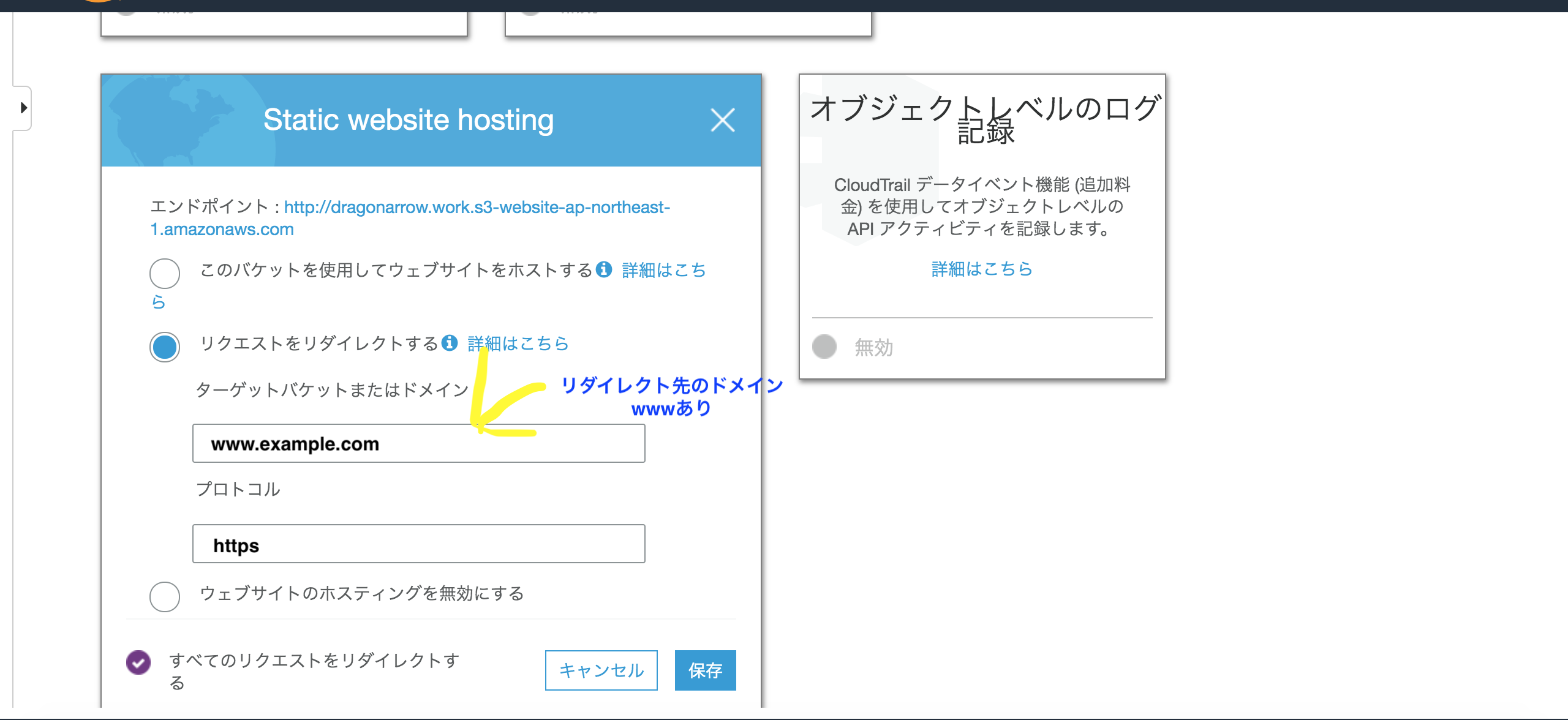4. 先ほどのリダイレクト用のバケットを指定