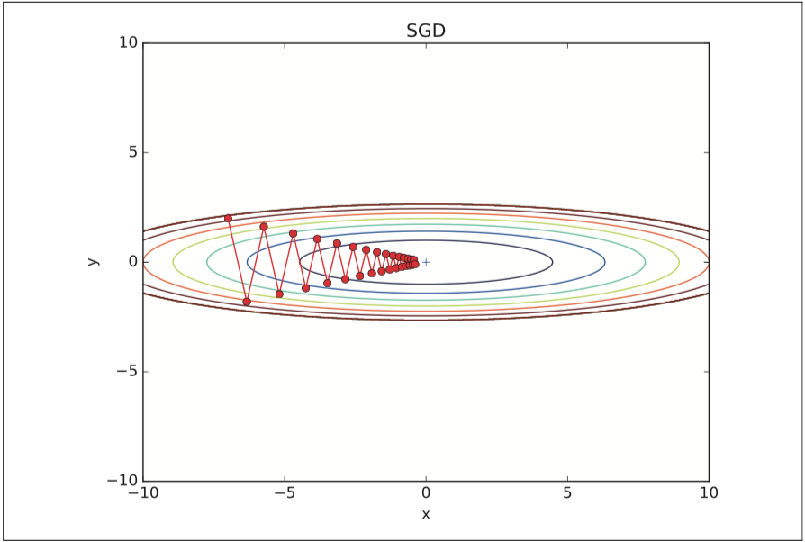 SGDの欠点は関数の形状が等方的でないとパラメータの更新が非効率