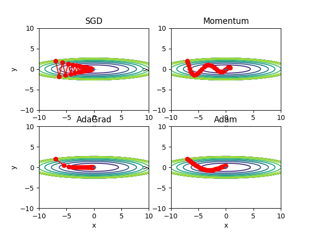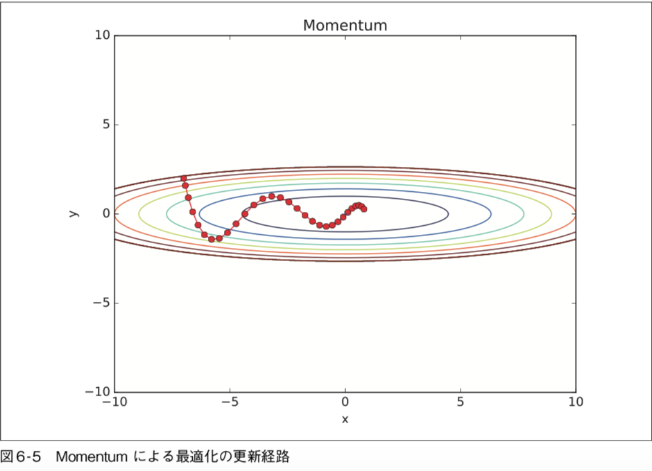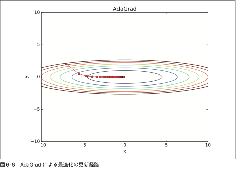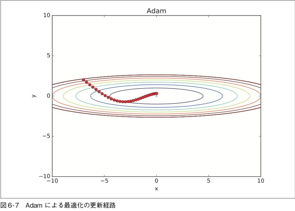 最小値に向かって効率的に動いているのが分かります。y 軸方向へは勾配が大きいため、最初は大きく動きますが、その大きな動きに比例し て、更新のステップが小さくなるように調整が行われます。そのため、y 軸方向への 更新度合いは弱められていき、ジグザグの動きが軽減されます。