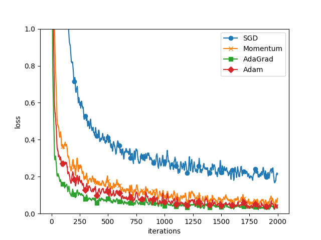 中でも、 AdaGrad の学習が少しだけ速く行われている。