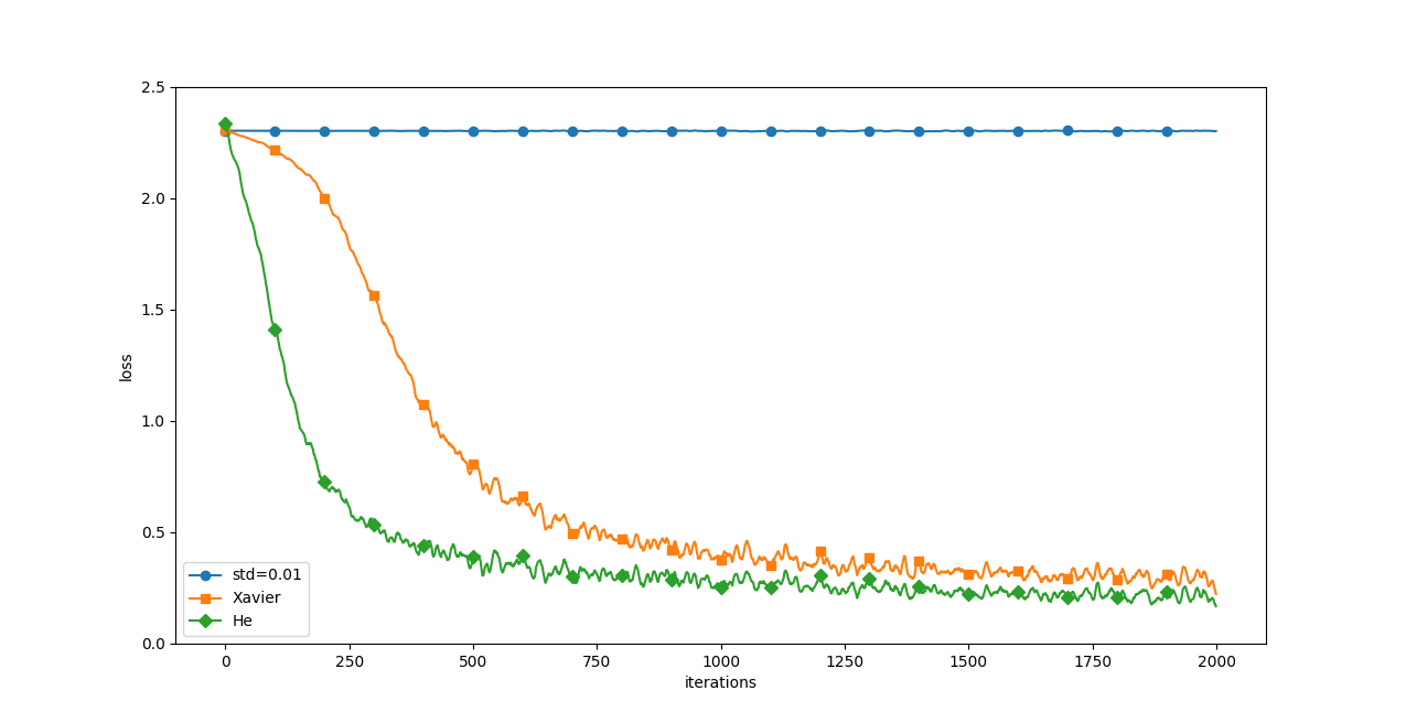 import os import sys sys.path.append(os.pardir) # 親ディレクトリのファイルをインポートするための設定 import matplotlib.pyplot as plt from dataset.mnist import load_mnist from common.util import smooth_curve from common.multi_layer_net import MultiLayerNet from common.optimizer import * # 0:MNISTデータの読み込み========== (x_train, t_train), (x_test, t_test) = load_mnist(normalize=True) train_size = x_train.shape[0] batch_size = 128 max_iterations = 2000 # 1:実験の設定========== optimizers = {} optimizers['SGD'] = SGD() optimizers['Momentum'] = Momentum() optimizers['AdaGrad'] = AdaGrad() optimizers['Adam'] = Adam() #optimizers['RMSprop'] = RMSprop() networks = {} train_loss = {} for key in optimizers.keys(): networks[key] = MultiLayerNet( input_size=784, hidden_size_list=[100, 100, 100, 100], output_size=10) train_loss[key] = [] # 2:訓練の開始========== for i in range(max_iterations): batch_mask = np.random.choice(train_size, batch_size) x_batch = x_train[batch_mask] t_batch = t_train[batch_mask] for key in optimizers.keys(): grads = networks[key].gradient(x_batch, t_batch) optimizers[key].update(networks[key].params, grads) loss = networks[key].loss(x_batch, t_batch) train_loss[key].append(loss) if i % 100 == 0: print( "===========" + "iteration:" + str(i) + "===========") for key in optimizers.keys(): loss = networks[key].loss(x_batch, t_batch) print(key + ":" + str(loss)) # 3.グラフの描画========== markers = {"SGD": "o", "Momentum": "x", "AdaGrad": "s", "Adam": "D"} x = np.arange(max_iterations) for key in optimizers.keys(): plt.plot(x, smooth_curve(train_loss[key]), marker=markers[key], markevery=100, label=key) plt.xlabel("iterations") plt.ylabel("loss") plt.ylim(0, 1) plt.legend() plt.show()