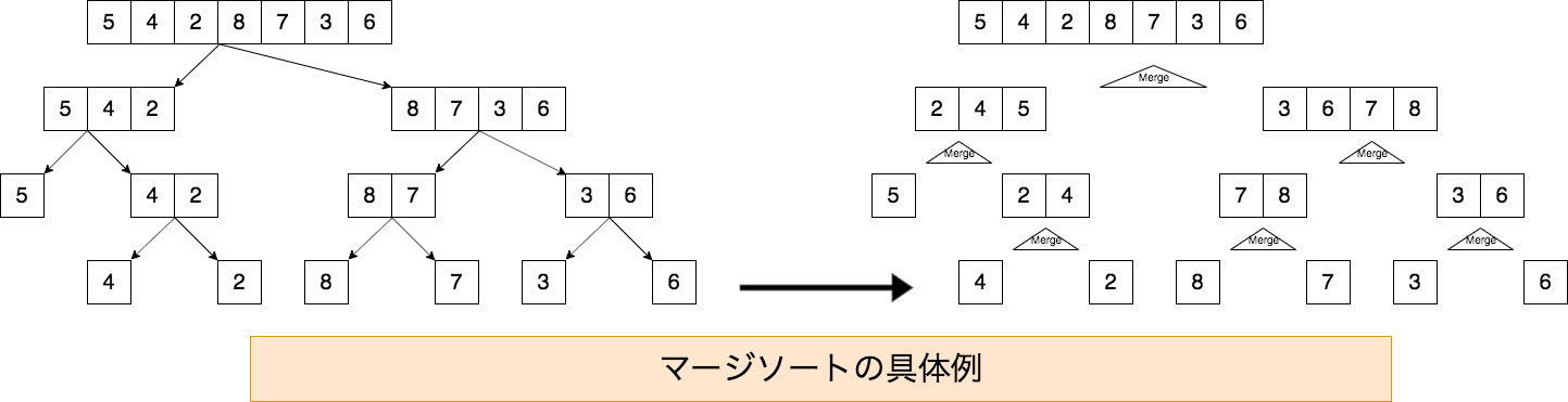 マージソートで大事なのは、1度でもマージされたブロックの要素は昇順になっていることである。