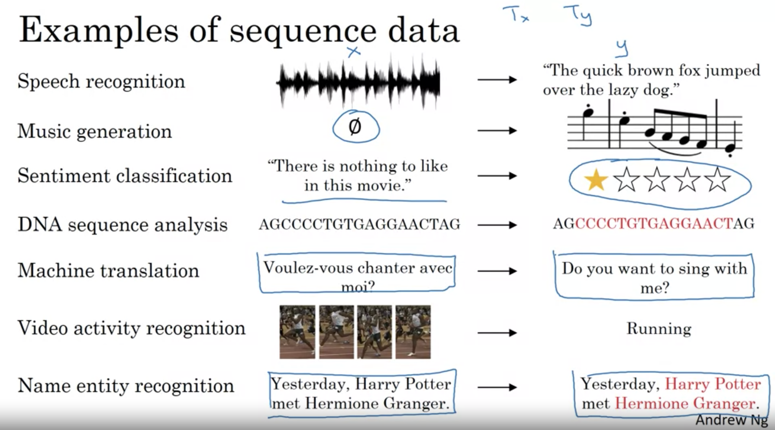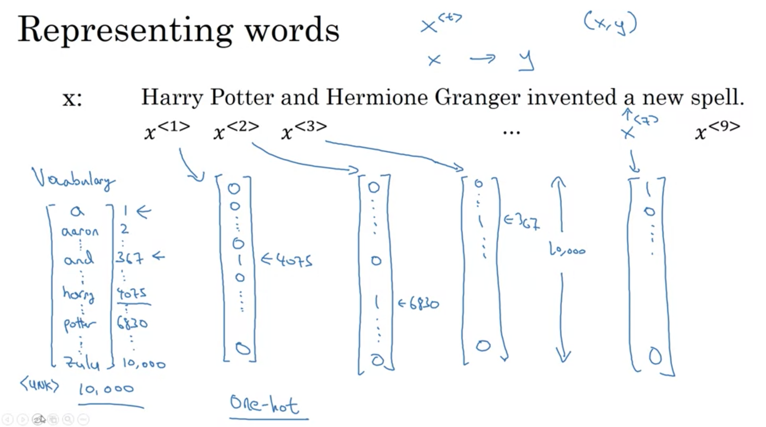 入力の9つの単語は\(x^{<1>},x^{<1>},...,x^{<9>}\)で表され、インデックスtにより、\(x^{<1>}\)で表現される。(tの由来はtemporal: 時間的な)