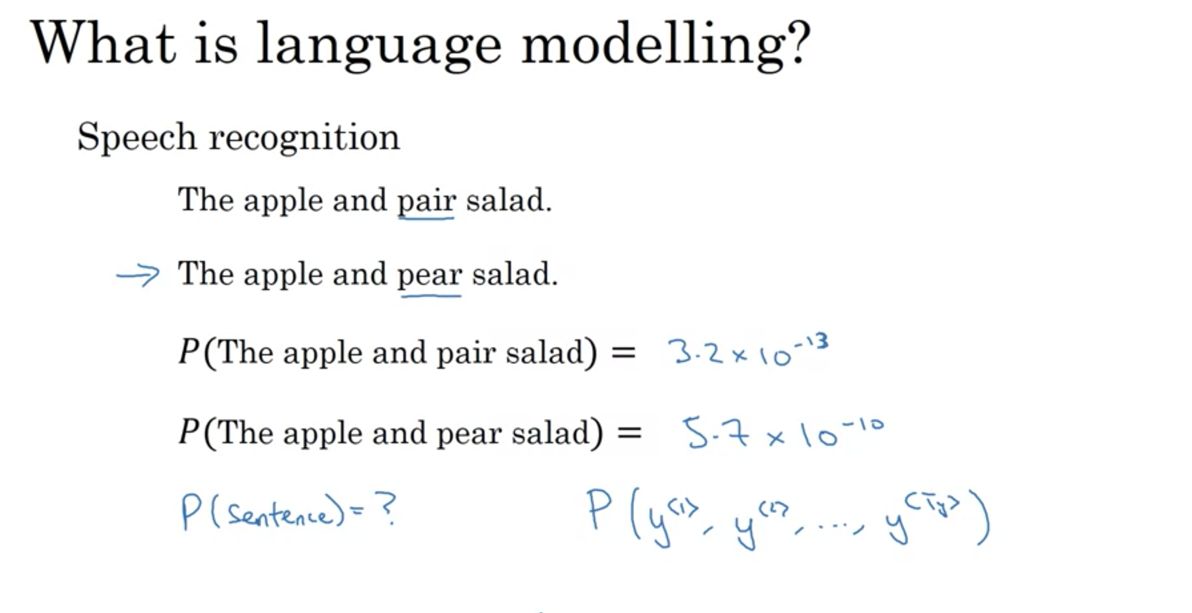 言語モデルとは、単語列に対する確率分布である。長さmの単語列が与えられたとき、単語列全体に対しての確率\({\displaystyle P(y^{<1>},\ldots ,y^{<m>})}\)を与える。 言語モデルを用いると異なるフレーズに対して相対的な尤度を求めることができるため、自然言語処理の分野で広く使われている。 言語モデルは音声認識、機械翻訳、品詞推定、構文解析、手書き文字認識、情報検索などに利用されている。