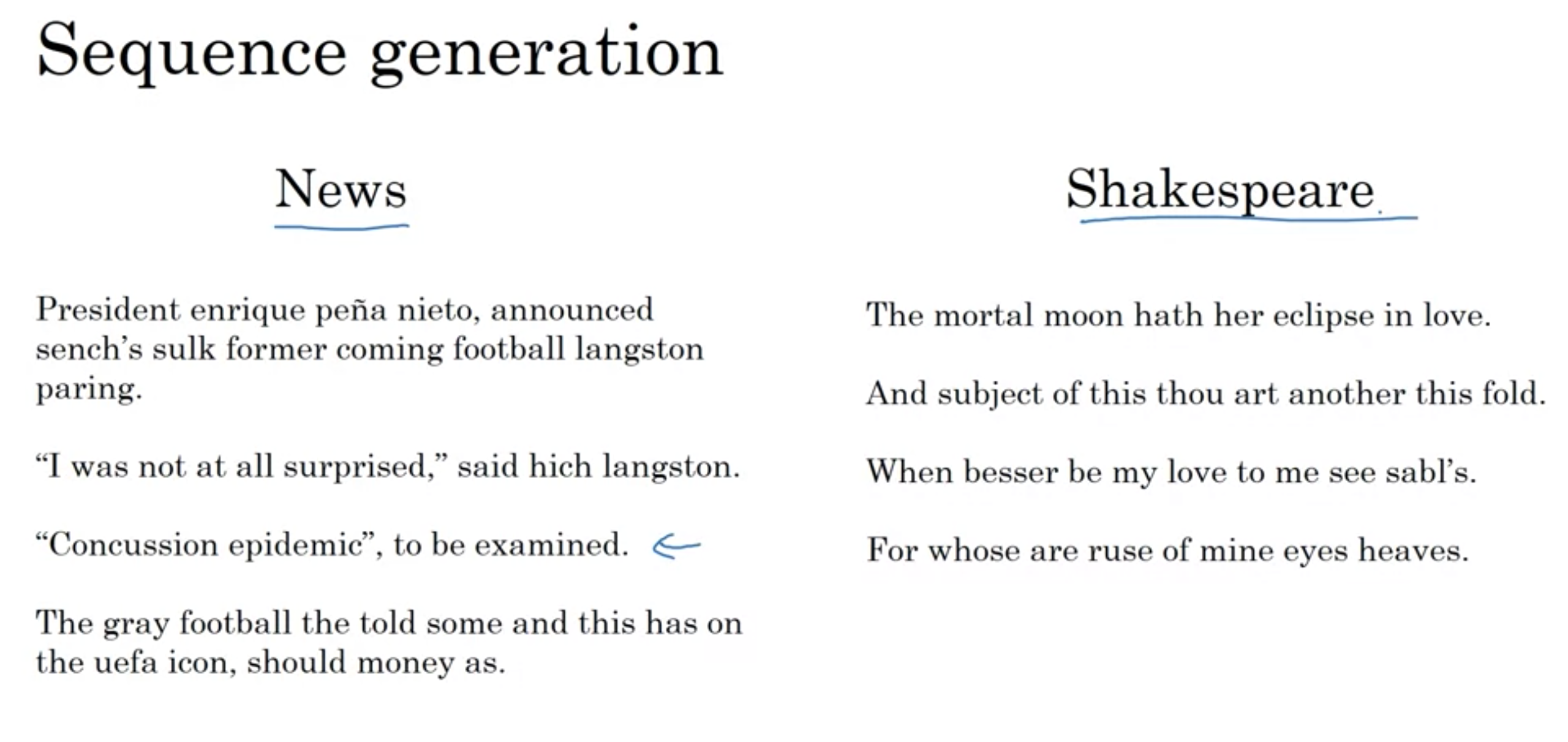 以下の左側の文章は、シェイクスピアのテキストで訓練されたモデルが生成したもので、それはシェイクスピアが書いたみたいに聞こえるものを生成します。