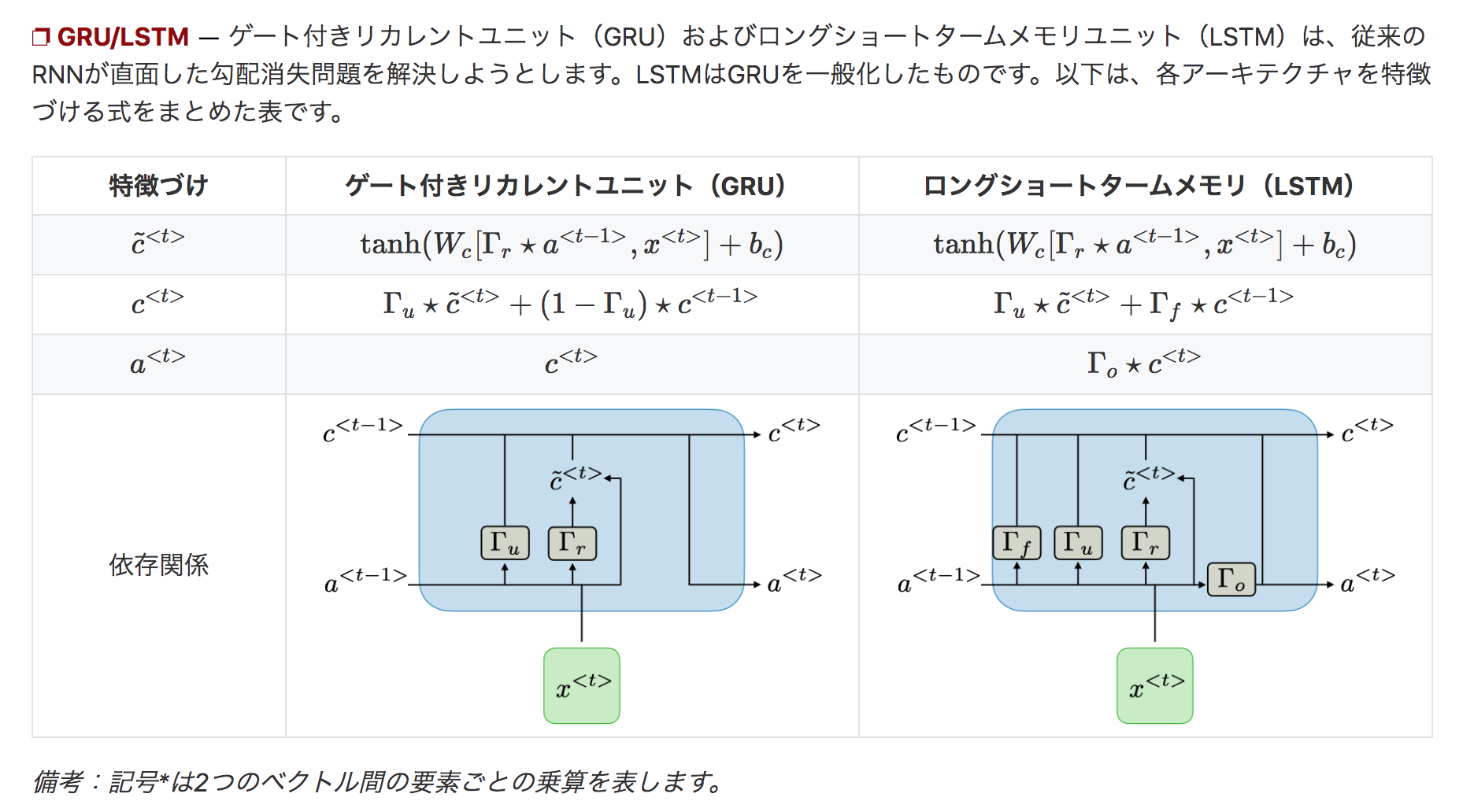 GRU/LSTM - ゲート付きリカレントユニット(GRU)およびロングショートタームメモリユニット(LSTM)は、従来のRNNが直面した勾配消失問題を解決しようとする。LSTMはGRUを一般化したもの。以下は、各アーキテクチャを特徴づける式をまとめた表。