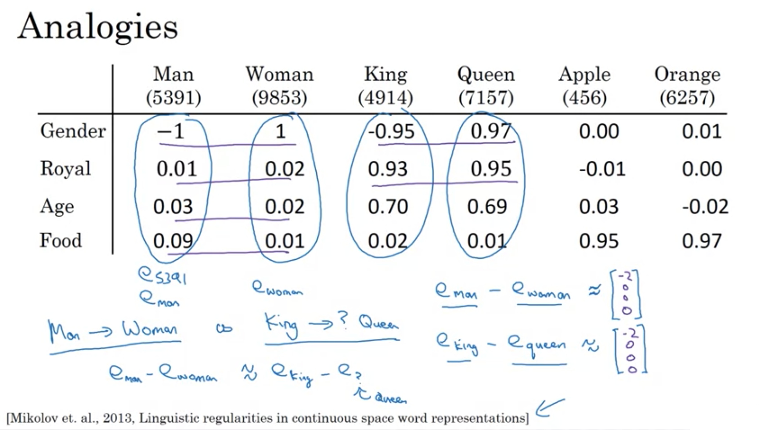 以下の結果から男と女の類似度はキングとクインの類似度と等しいことがわかる。
