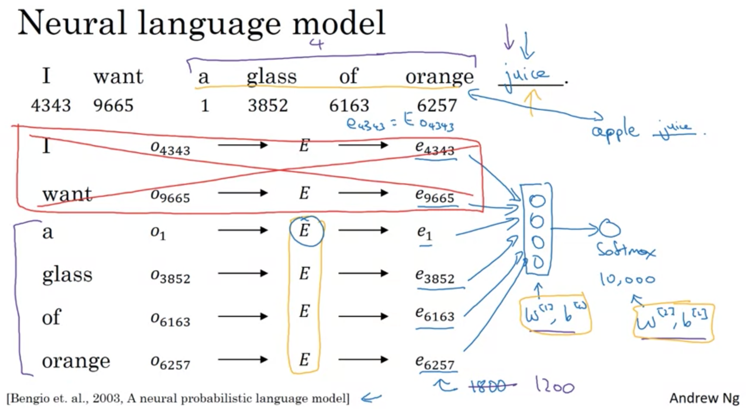 例えば、前の4つの単語から次の単語の予測を行う場合、a, glass, of, orangeの4ベクトル(300行のベクトル)が入力になる