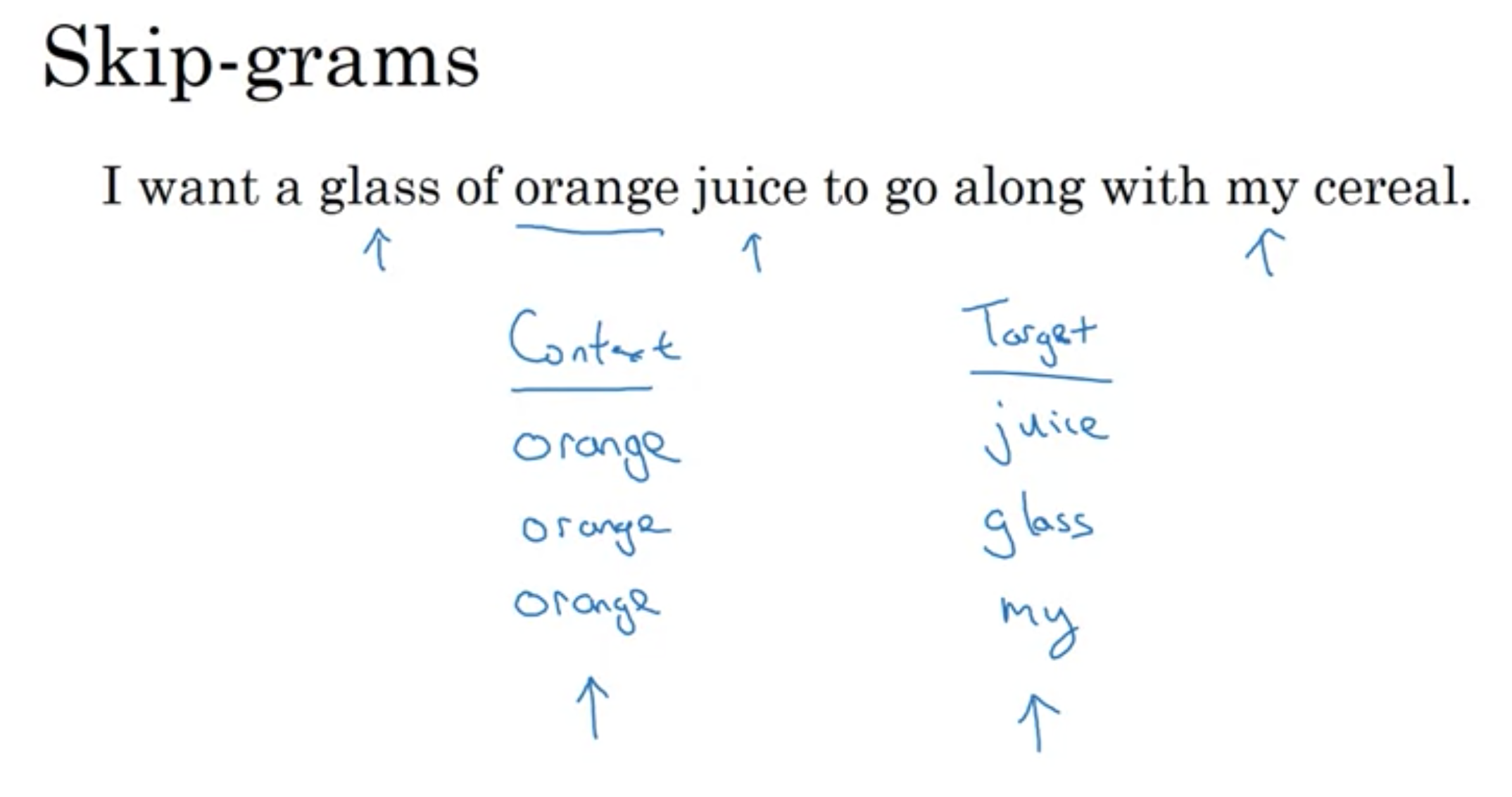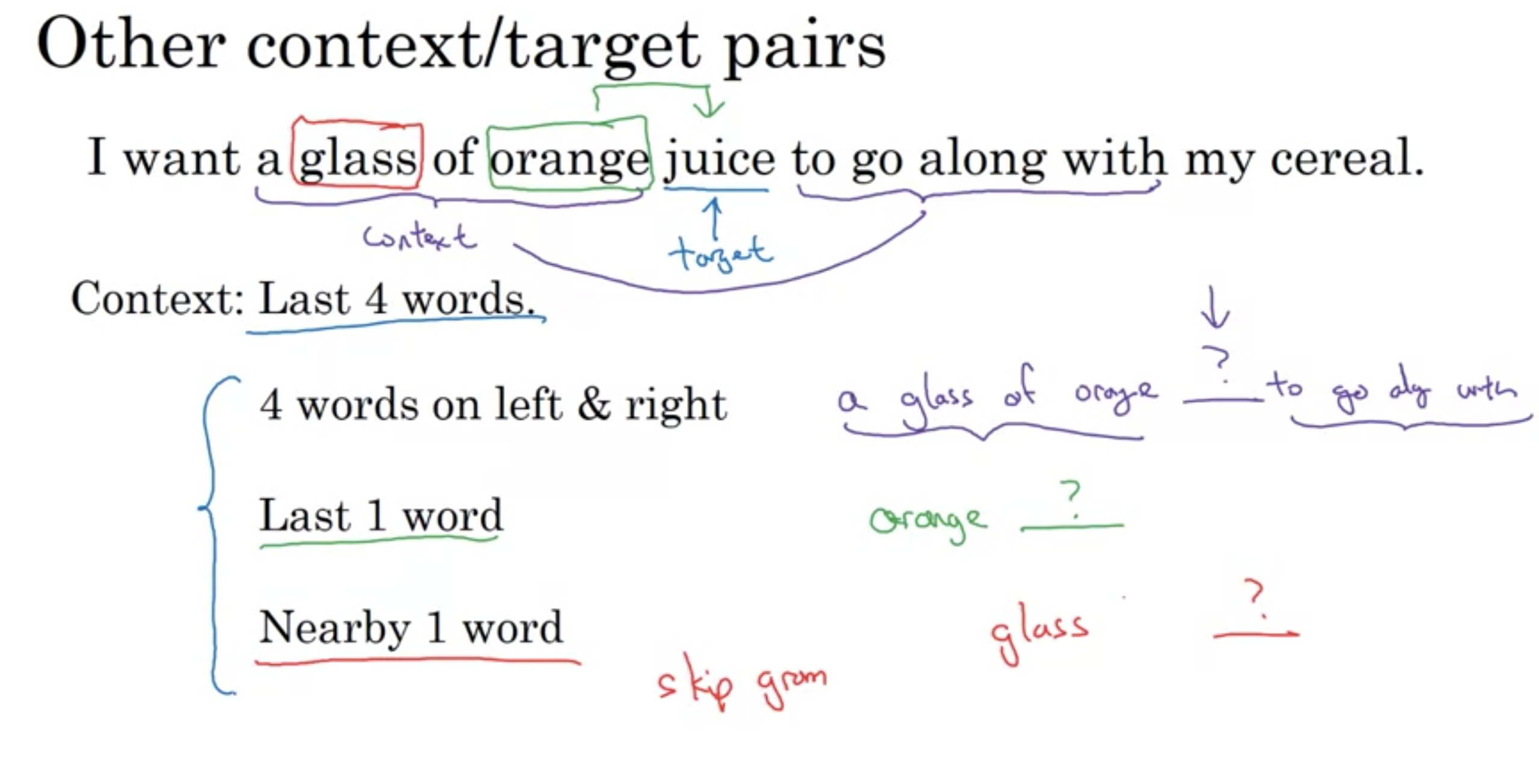 コンテキストを常にターゲット単語の直前の最後の4単語または最後の直前単語にするのではなく、たとえば、コンテキスト単語としてランダムに単語を選択します。そして、オレンジという言葉を選んだとしましょう。
